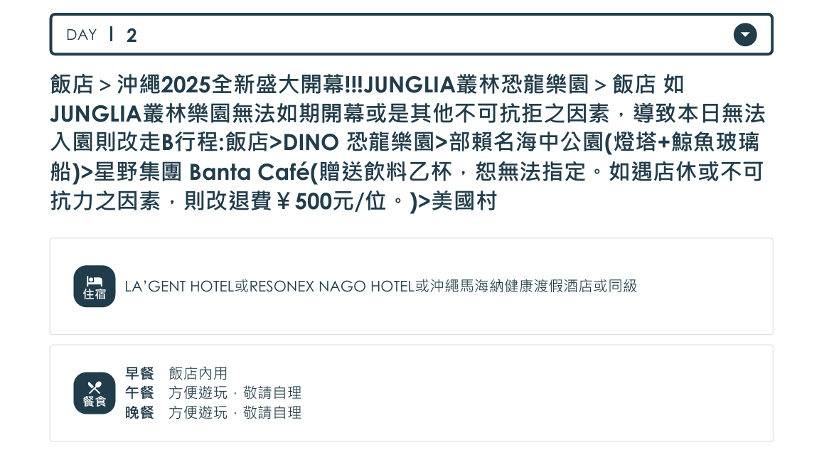 如JUNGLIA叢林樂園無法如期開幕或是其他不可抗拒之因素,導致本日無法入園則改走B行程: