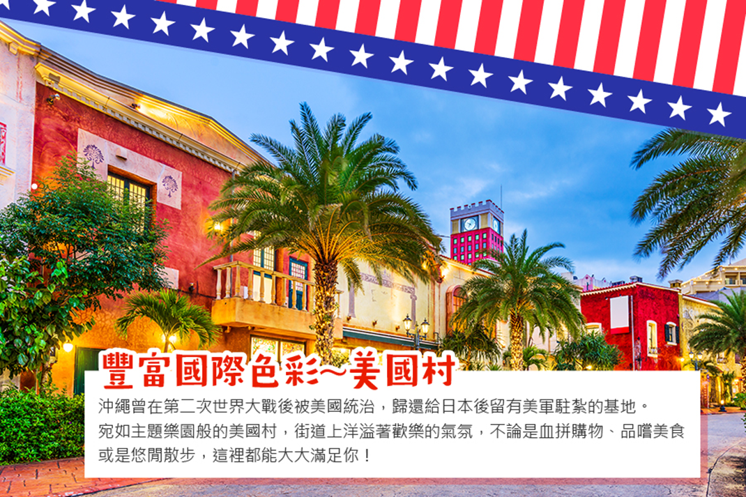 美國村是位在沖繩中部地區北谷町的美濱,距離那霸機場大約20公里,開車需花費40分鐘左右。沖繩曾在第二次世界大戰後被美國統治,歸還給日本後留有美軍駐紮的基地。最初是利用駐日美軍歸還的土地與填海地區所規劃建造而成,由於鄰近的美軍設施與居民為數眾多,遂洋溢著濃厚的美國風情。除了日本國內外遊客,也有很多駐日美軍相關人士前來造訪。在擁有豐富國際色彩的沖繩縣內,美國村可說是最具美國風情的地方。