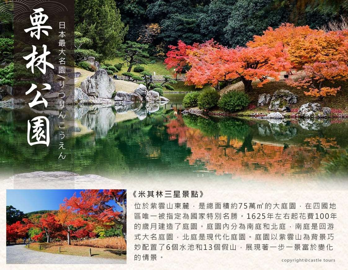 ★栗林公園:位於紫雲山東麓,是總面積約 75 萬㎡的大庭園,在四國地區唯一被指定為國家特別名勝。1625 年左右起花費 100年的歲月建造了庭園。庭園內分為南庭和北庭,南庭是回游式大名庭園,北庭是現代化庭園。庭園以紫雲山為背景巧妙配置了 6個水池和 13 個假山,展現著一步一景富於變化的情景。以黑松為主,還有多彩的樹木、春季的櫻花、初夏.的蓮花和菖蒲、冬季的山茶等,不同的季節和時間有不同的韻味,可以觀賞各個時節的美景。南湖上架設著弧度優美的偃月橋,從東端的假山飛來峰眺望的、借景濃綠紫雲山的南湖、偃月橋和 3 島美景是栗林公園的代表性風景。