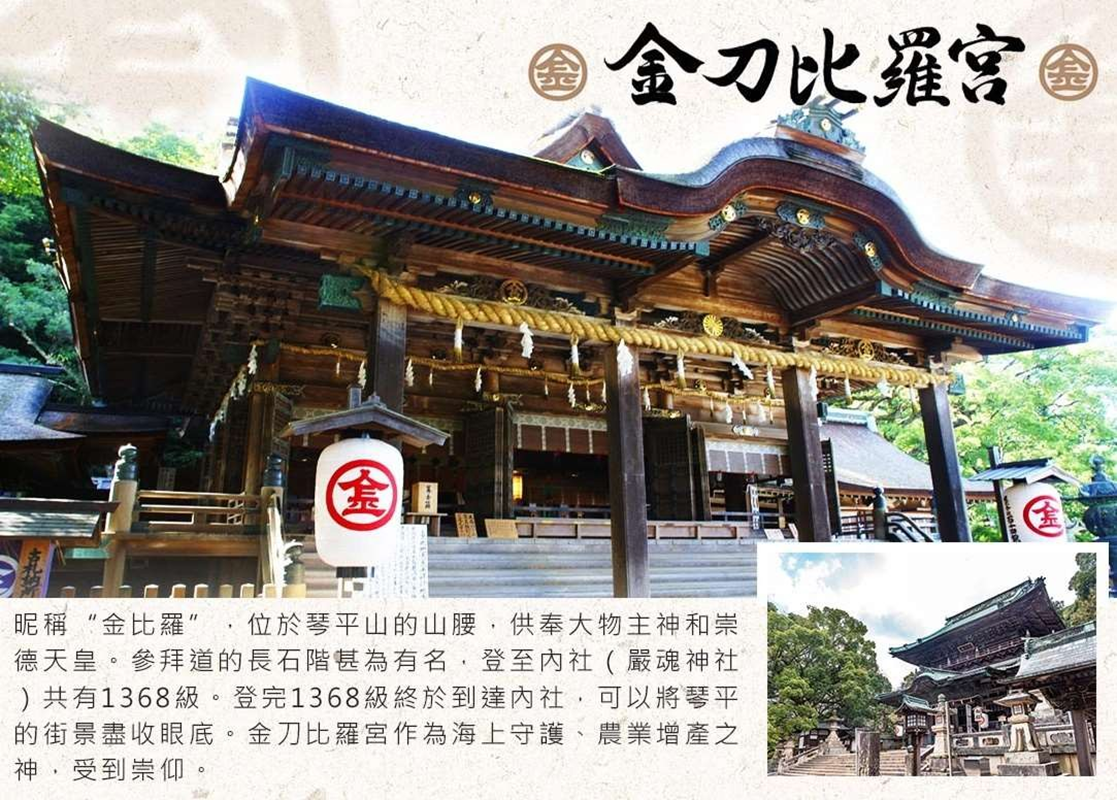 ●金刀比羅宮:昵稱“金比羅”,位於琴平山的山腰,供奉大物主神和崇德天皇。參拜道的長石階甚為有名,登至內社(嚴魂神社)共有 1368 級。登 365 級即到“二層入母屋造”結構的大門。從大門向前即是神社院內,至此可以像江戶時代那樣乘坐石階抬轎。到大門之前的道路兩側,土產店、飲食店等鱗次櫛比,還出租拐杖。穿過大門則排列著撐著大傘的 5 家點心店“五人百姓”,是由於先祖的功德而被特許在神社院內營業的具有歷史的小店。沿著石階向上攀登,柱間和門扉上刻著美麗雕刻的旭社、室內用圓山應舉和伊藤若沖的障壁畫加以裝飾的書院等的正殿、寶物館、鳥居等數個遺址、看點接連不斷,登 785 級即到本宮。登完 1368 級終於到達內社,可以將琴平的街景盡收眼底。金刀比羅宮作為海上守護、農業增產之神受到崇仰,江戶時代一般認為一生一定要參拜一次,全國各地有很多參拜者來訪。