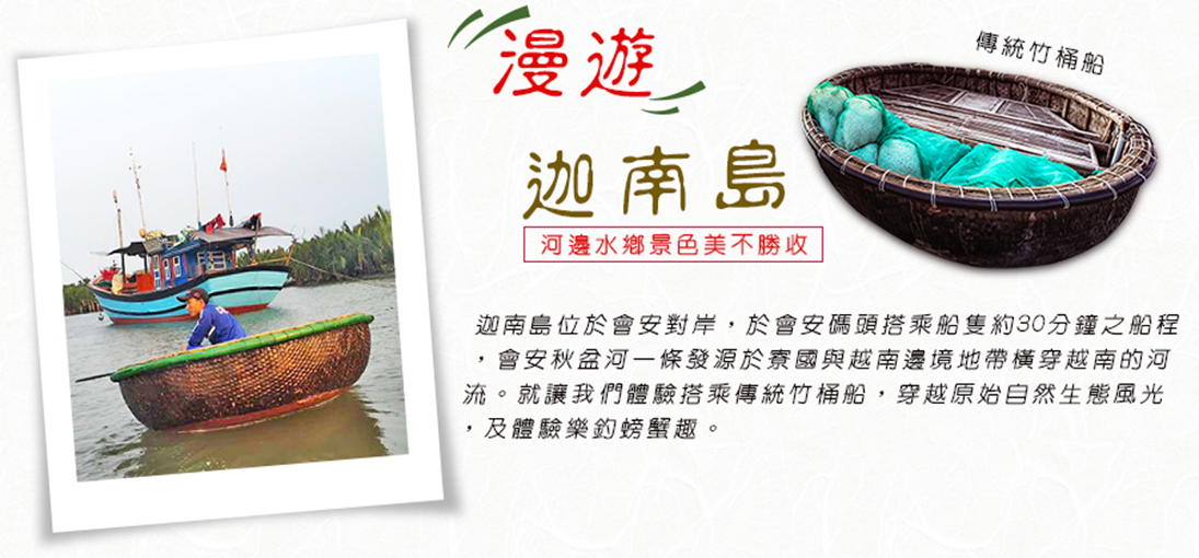 ◆迦南島:迦南島位於會安對岸,於會安碼頭搭乘船隻約30分鐘之船程,會安秋盆河一條發源於寮國與越南邊境地帶橫穿越南的河流,河邊水鄉景色美不勝收。秋盆河會安這側商鋪林立;對岸也就是迦南島還尚未開發,是一片相對原始的自然生態風光,岸上密布著水椰林、檳榔樹,島上居民大多以捕魚及木雕維生。就讓我們體驗搭乘傳統竹桶船,穿越原始自然生態風光,及體驗樂釣螃蟹趣。※竹桶船小費20000越盾或1美金。