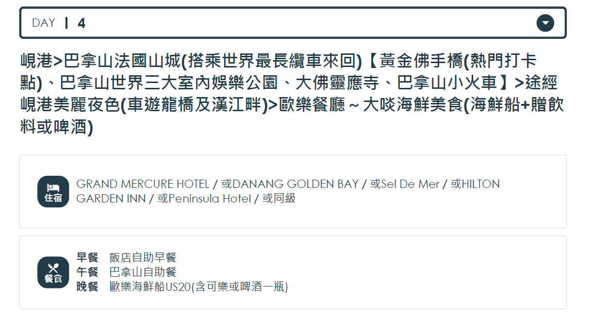 ◆法國山城巴拿山:地勢優美,素有法國春天山城之美譽!在此搭乘被列為健力士記錄的全球最長及最高不停站纜車,20分鐘直達海拔4239呎的山上。纜車剛開始攀升,腳下盡是樹林石澗溪流,10分鐘後以身處於雲海當中,眼前景像猶如身處仙境之中。法國人曾在此建立避暑區,氣候一日四季。婆納有遼闊的自然林,溪泉縱橫其間,天氣晴朗時,站在主山頂,可以看見峴港市、容橘灣、美溪海等整個寬廣空間,猶如一幅巨型山水畫。