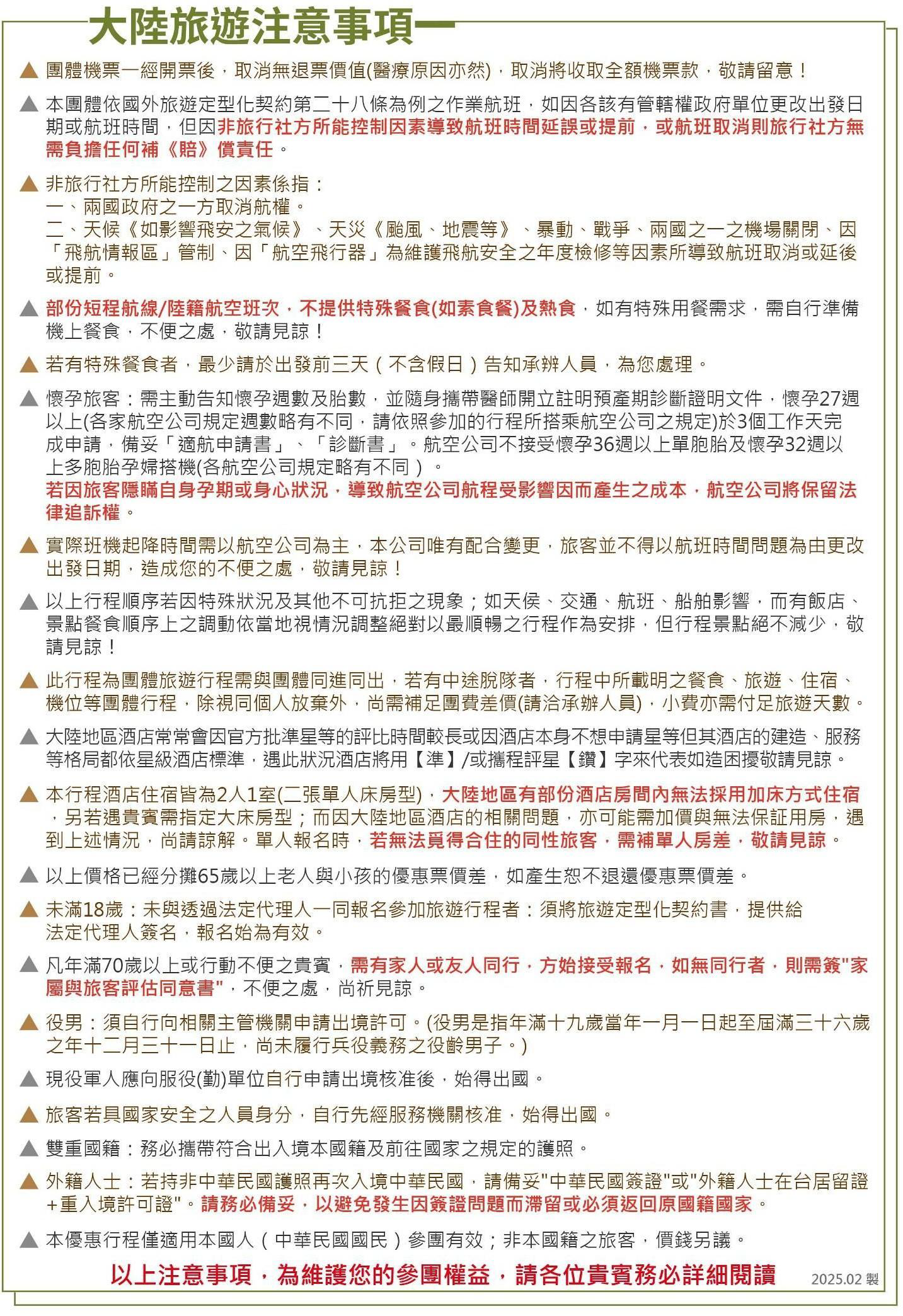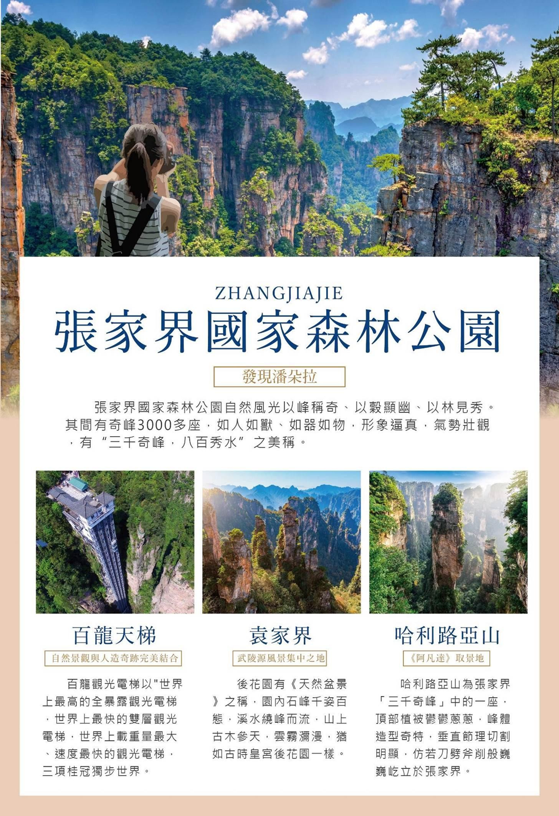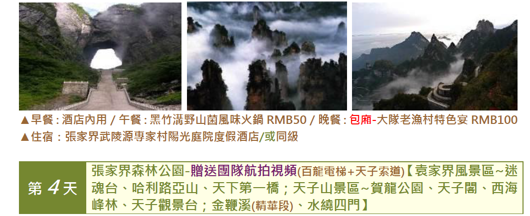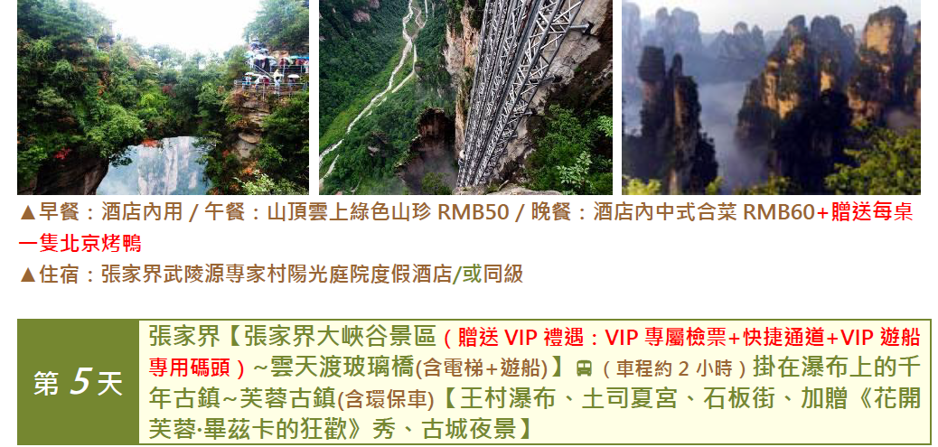 ①天子山/袁家界景區走路比較多,且景區道路為狹窄棧道,建議客人穿著平底防滑鞋,避免滑倒;景區內的中餐因條件所制約,因此菜色餐廳方面較其他餐稍遜,望客人諒解!