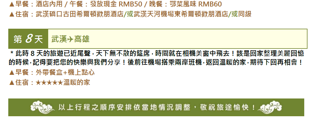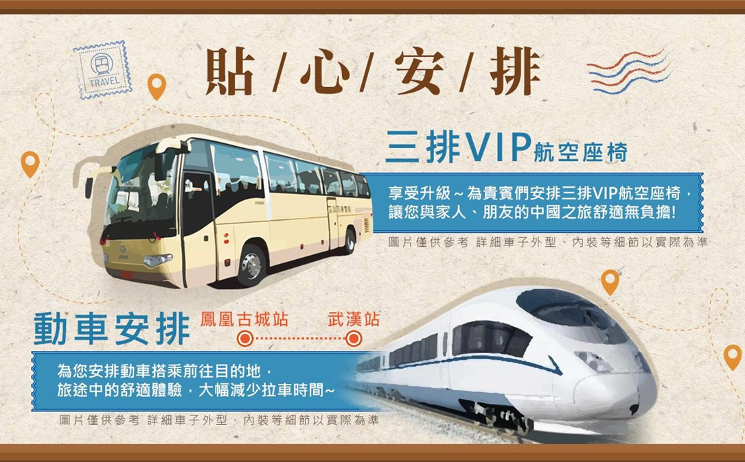 溫馨小提示:因「高鐵鳳凰古城站-武漢站」每日只有二班直達車次,如遇訂不到車票時,替代方案會改為「懷化站-武漢站」,最終搭乘起始站以出團說明會資料為主,敬請知悉!