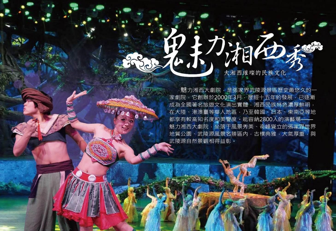 魅力湘西秀:魅力湘西大劇院,是張家界武陵源景區歷史最悠久的一家劇院,它創辦於 2000 年 3月,歷經十五年的發展,已逐漸成為全國著名旅遊文化演出實體,湘 西民族特色濃厚鮮明,在大陸、港澳臺等華人地區,乃至韓國、日本、東南亞等地都享有較高知名度和美譽度。