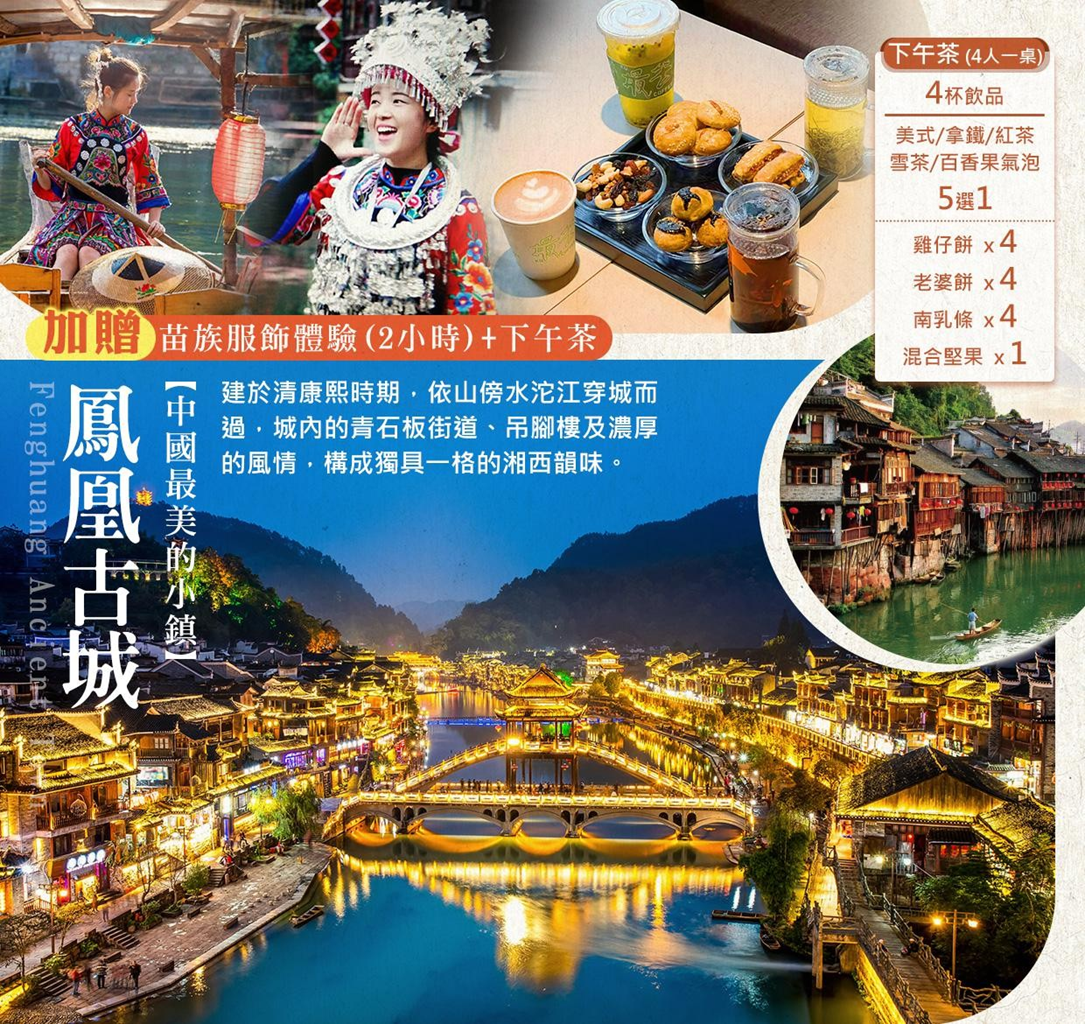南華山景區+下午茶:位於古城中心虹橋旁,從這裡俯瞰古城全景:千年古城,盡收眼底,萬家燈火,十裡風光。這裡是黃永玉大師在家鄉大地上的藝術巨著,是鳳凰旅遊的經典行程、鳳凰文旅新地標。7800 年的鳳凰文化在這裡充分展現,中國首個鳳凰文化全體驗景區,中華龍鳳兩大傳統圖騰體系中的鳳凰圖騰、一小時讀懂千年歷史的“鳳”文化。