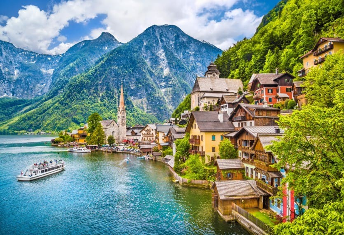 猶如仙境童話般美麗,湖畔⼭坡上⾊彩柔和的歐式⽊造建築,以群⼭為背景,映著碧綠的湖⽔,正是奧地利最具代表性的風景。