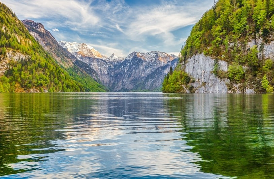 德奧邊境上的國王湖,在最後⼀個冰河時期由冰川形成,是德國最深的湖泊。國王湖因其清澈的湖⽔⽽聞名,它被認為是德國最乾淨和最美麗的湖泊,湖⾯狹⻑,兩岸群峰環繞,⼭⾼⽔深,既有北歐峽灣之峻峭、壯闊之典雅!