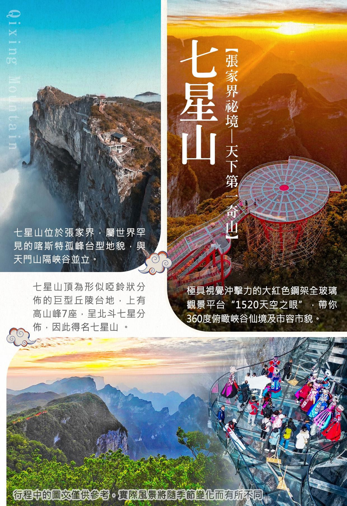 七星山國家森林公園:七屬世界罕見的喀斯特孤峯台型地貌,四面為不規則的懸崖絕壁,山頂為形似啞鈴狀分佈的巨型丘陵台地,面積約為 12 平方公里,是天門山山頂面積的 5 倍,平均海拔 1400 米,山頂台地上有較高山峯 7 座,呈北斗七星分佈,因此得名七星山。七星山環斷崖一週約為 50 公里,絕大部分崖壁段落落差超過 300 米,少許段落為 100-200 米階梯狀斷崖,亦有完整崖面垂直孤聳,近千米落差,世所罕見,蔚為奇觀。
