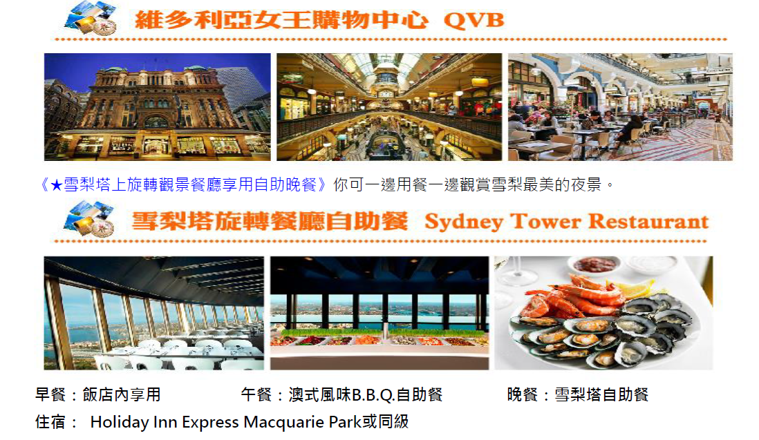 《QVB 維多利亞女王購物中心》雪梨最著名的購物中心完成於1898年,當初是建來慶賀女王的50週年慶,法國設計師Pierre Cardin曾說QVB是「全世界最漂亮的購物中心,古典優雅的內部裝設,為一拜占庭風格的建築物。QVB最聞名的就是其內部彩繪玻璃外部以銅覆蓋的圓形屋頂是羅馬風格結構建築特色是美麗的彩色玻璃窗、花紋地磚、復古的色彩。QVB分為地下一層與地上四層200公尺長的大廈佔了整個街區4個主要樓層的正面為高雅的維多利亞風格的商店有各式各樣世界精品名牌還有澳洲本土品牌服飾、珠寶店、藝廊、化妝品、飾品、咖啡店、餐廳等超過200家。