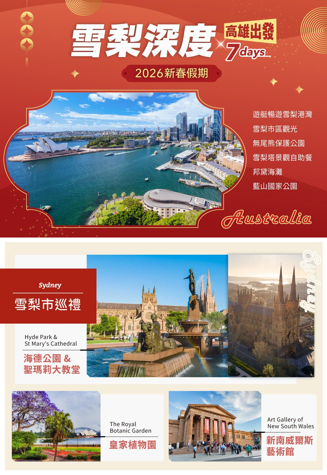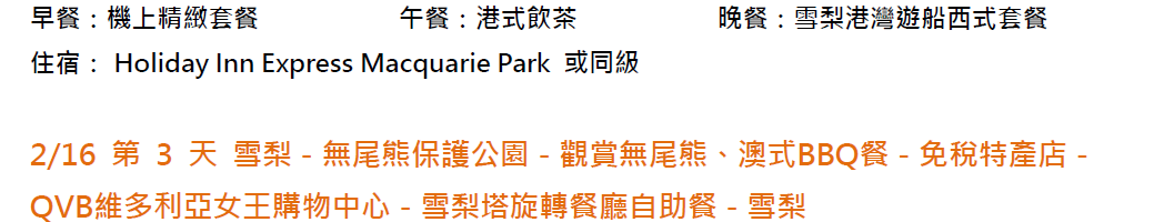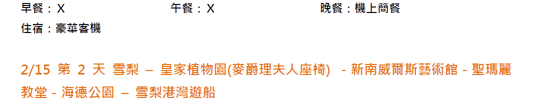 今日集合於高雄小港國際機場,辦理出境手續後,搭乘豪華客機經香港飛往澳洲第一大城─雪梨。 出發嚕!計畫許久的旅遊終於要出發了,也許因為太過興奮使您無法在機上入睡,機上有許多娛樂設施,遊戲機、旅遊頻道、各式音樂以及首映電影等等...,讓您可以有個舒適的睡眠以迎接即將開始的旅程。夜宿於機上。