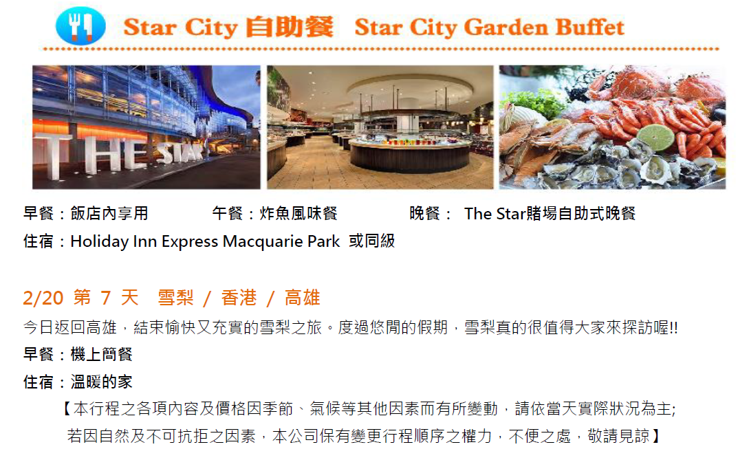 今日特別安排在雪梨著名的【The Star賭場自助餐】,享用數十道豐盛的自助式晚餐。餐後前往機場搭機返台,結束此次澳洲之旅。