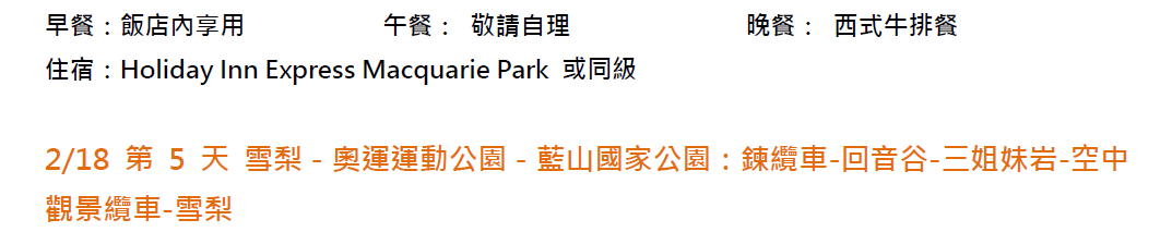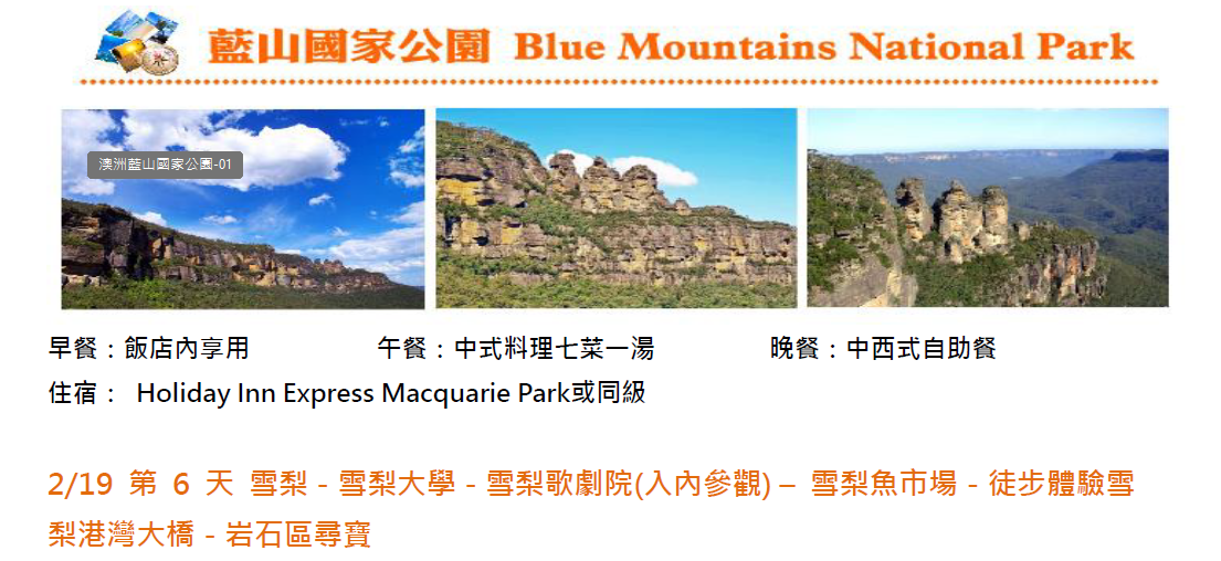 早餐後、出發前往藍山國家公園,首先來到西元2000年奧運場地《奧林匹克運動公園》您可感受世紀奧運會場地的宏偉建築,雖然時序已過,但此地環保設計理念,讓澳洲人最感驕傲。