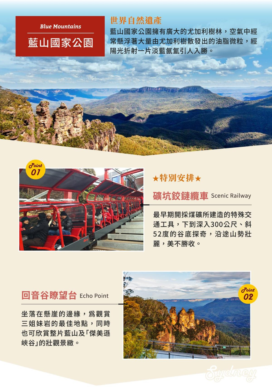 於西元兩千年被聯合國教科文組織列入世界自然遺產之列的《藍山國家公園》,富含著大面積的原始叢林和亞熱帶雨林的林相,其中以 【尤加利樹】最富盛名,尤加利樹乃為澳洲的國樹,種類繁多約有 500多種,是澳洲珍貴的有袋類生物無尾熊的最佳食品,在森林步道中浸沐在大自然的芬多精裡,空氣中彌漫著尤加利樹的清香,給人一種心曠神怡的感受。