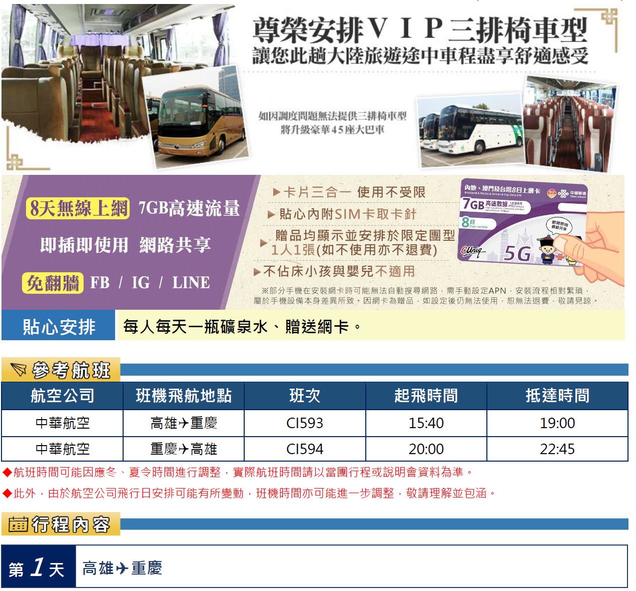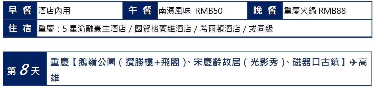 今日集合於國際機場,搭乘直航客機飛往重慶,接機入住酒店休息。