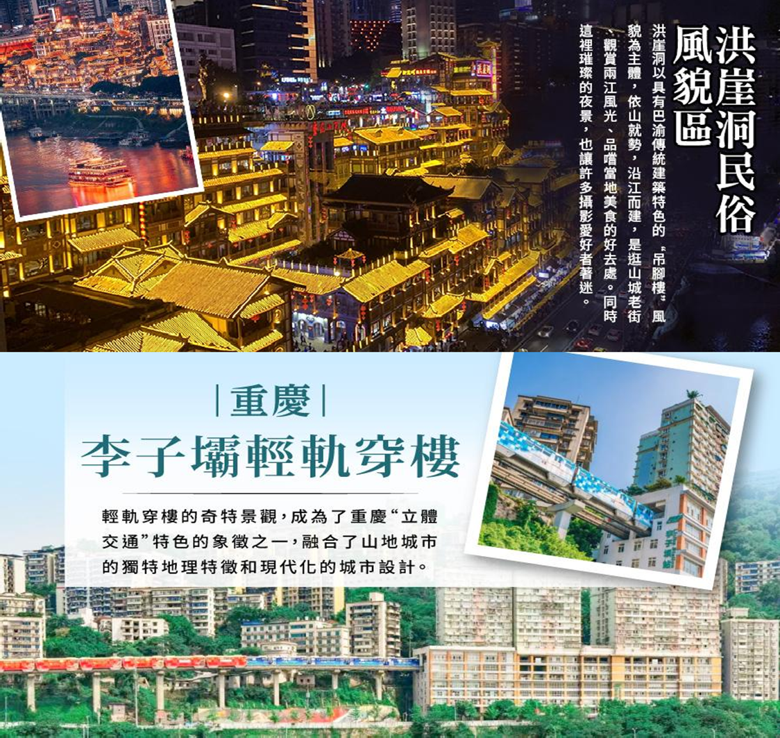 【洪崖洞古建築群】以最具巴渝傳統建築特色的「吊腳樓」風貌為主體,依山就勢,沿江而建,讓解放碑直達江濱。天成巷巴渝風情街為世人展示的一種不同於以往的時尚潮流,展示出當時盛行於世的青磚、石瓦、紅簷綠瓦的古典民居。遊客可乘坐扶梯或觀光電梯達到洪崖洞的任何一層樓。四條大街分別融匯了當下所有時尚元素,主題迥異、特色鮮明,絕對是今天來重慶不可不去的地方。