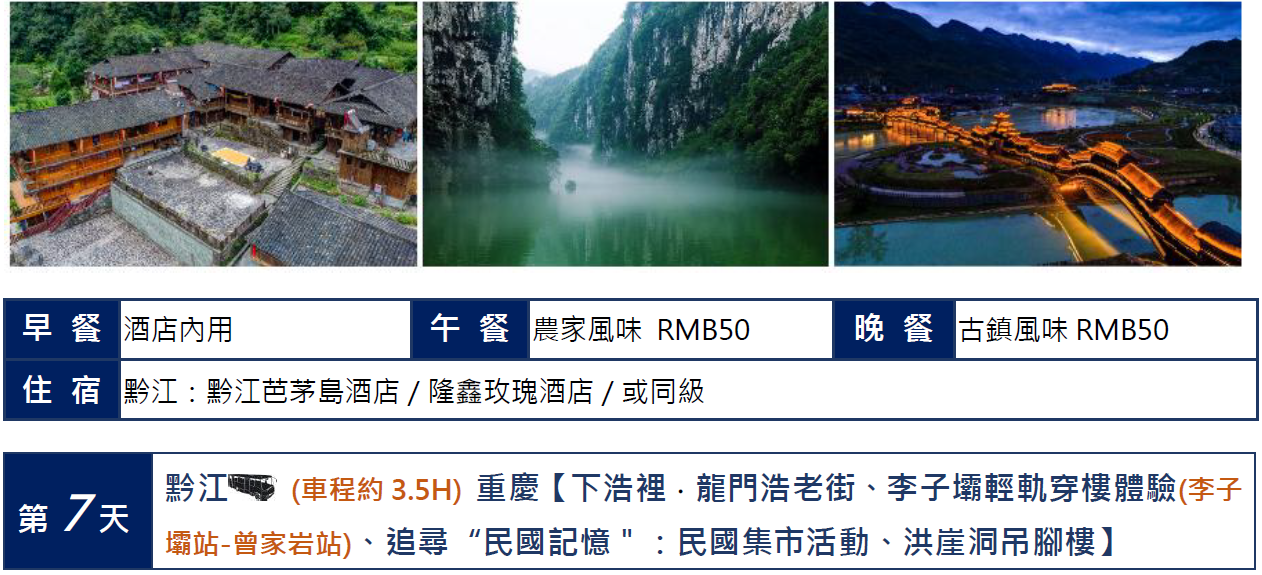 【酉州古鎮】一條全長 1.3 公里的民族風情街,名武陵古州,現名酉陽古城,主要以土家族苗族文化為載體,集土家族苗族建築、民俗風情於一體,是遊人領略渝東南土家族苗族文化的窗口,品味渝東南民俗文化。