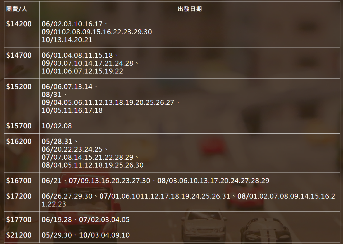 ◆團費/出發日期◆(出發日期不同~報價不同)
