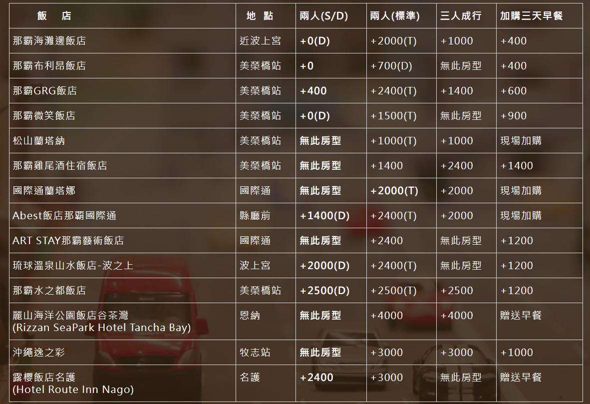 ★特別注意:那霸GRG、布利昂二家飯店若旅客需加購早餐,學齡前3-6歲之不佔床兒童亦需付費。
